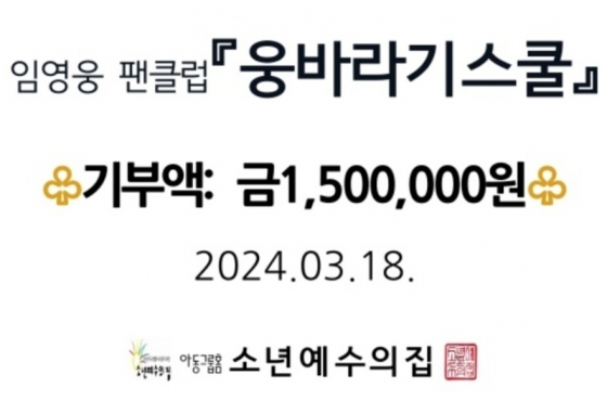 임영웅 팬클럽 '웅바라기스쿨'은 3월 18일 서울 송파구 아동그룹홈 소년예수의집에 150만 원을 기부했다.