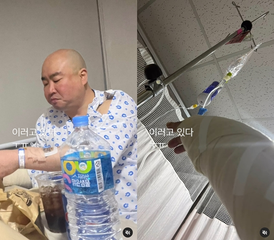 공개된 사진에는 '이러고 있다'라는 문구와 함께 길이 환자복을 입고 병실에 있는 모습이 담겼다. 다소 부은 얼굴을 한 모습이다. 또한 팔에 깁스를 한 사진도 공개돼 눈길을 끌었다.