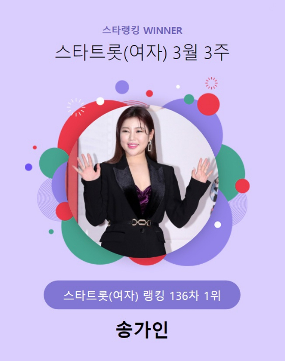 가수 송가인이 스타랭킹 스타트롯 여자 랭킹 투표에서 1위에 등극했다.