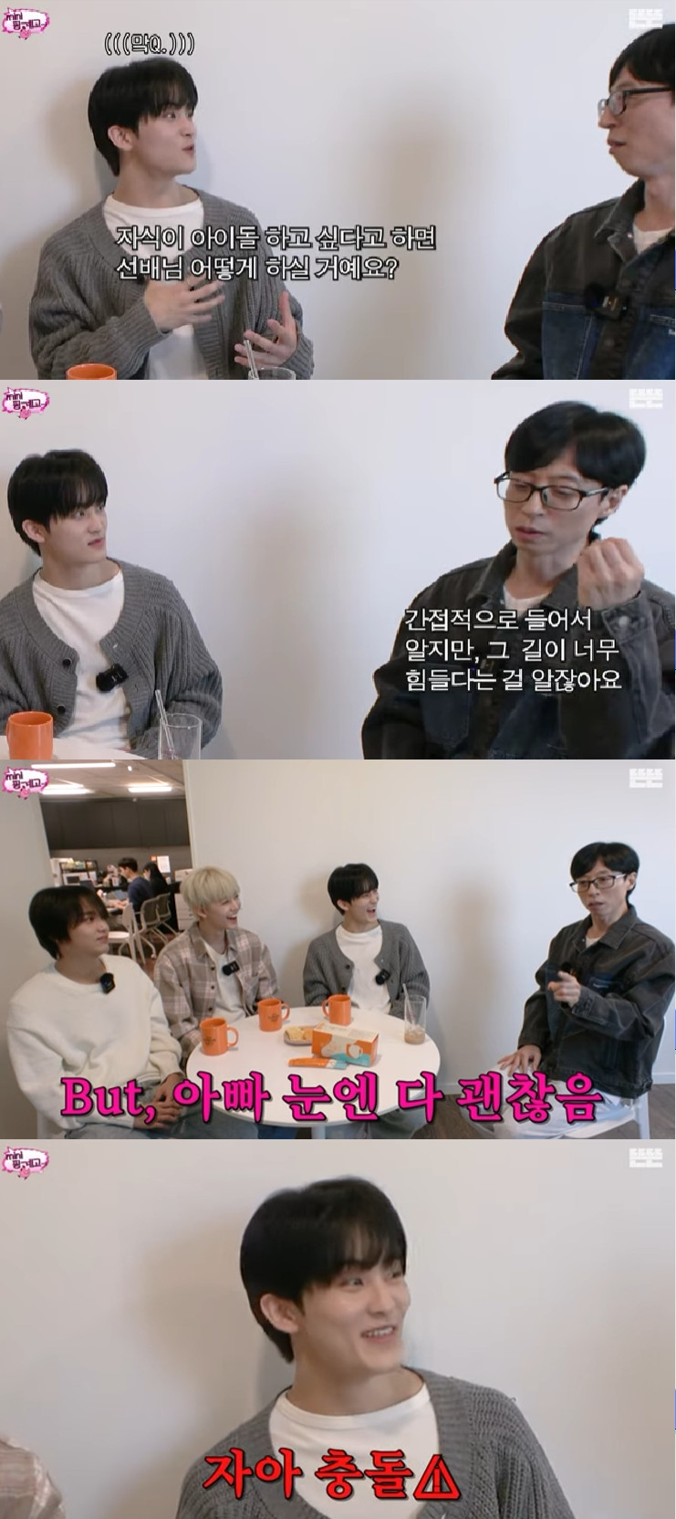 이어 "만약에 자식이 아이돌 하고 싶다고 하면 어떻게 하실 거냐"라고 물었고, 유재석은 "재능이 있고, 본인이 하고 싶다고 해도 선뜻 하라고 못할 것 같다. 저도 연예계에 있다 보니까 간접적으로 듣는 거지만, 그 길이 너무 힘들다는 걸 안다. 기획사 오디션에 합격하기도 힘들고, 데뷔를 하기까지 단계가 너무 많다"고 말했다.