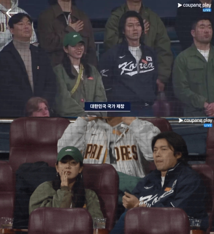 이날 중계에는 관중석에 앉아 있는 현빈, 손예진 부부가 잡혀 눈길을 끌었다. 손예진은 초록색 모자를 썼고, 현빈은 장발에 한국 야구 국가대표 점퍼를 입고 착용했다. 결혼과 출산 후 현빈, 손예진 부부가 함께 있는 모습이 포착된 것은 처음이다. 두 사람은 관중석에 나란히 앉아 야구 경기에 집중하는 모습을 보였다.