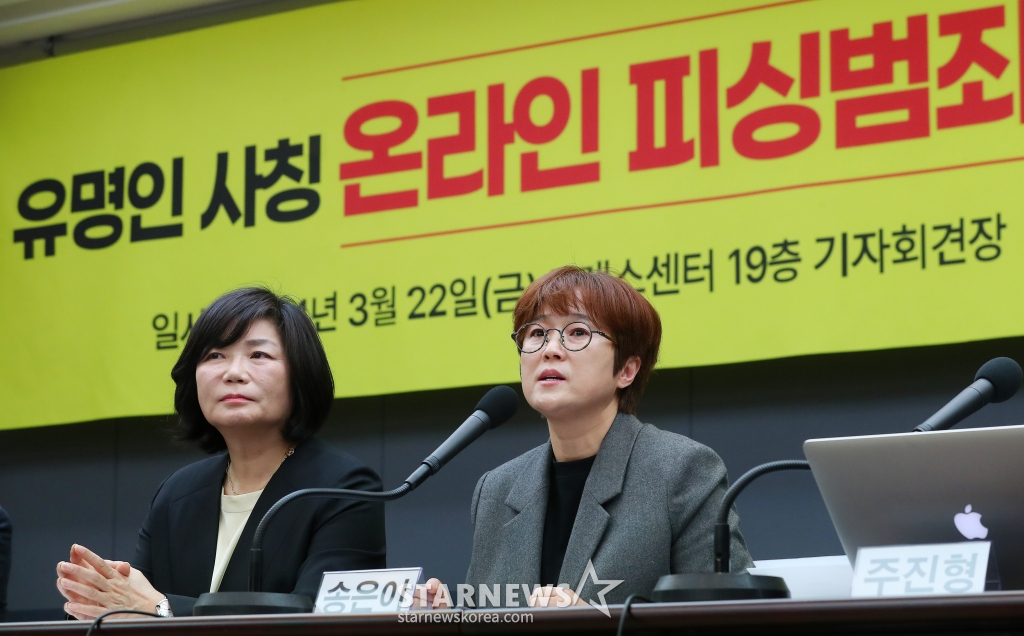연예방송유명인 사칭광고 심각성 알리는 송은이[★포토]발행 : 2024.03.22 ・ 15:15김창현 기자방송인 송은이가 22일 오후 서울 중구 한국프레스센터에서 진행된 '유명인 사칭 온라인 피싱범죄 해결 촉구' 기자회견에 참석해 발언을 하고 있다.'유명인 사칭 온라인 피싱 범죄해결을 위한 모임' 유명인을 사칭한 온라인 피싱 범죄의 심각성을 알리고 플랫폼과 정부의 해결 노력을 촉구하는 성명서를 발표했다. 2024.03.22<저작권자 © 스타뉴스, 무단전재 및 재배포 금지>유사모유명인사칭온라인피싱범죄피싱범죄송은이피싱추천 기사김창현 기자기자홈좋아요 연예-방송의 인기 급상승 뉴스연예-방송의 최신 뉴스