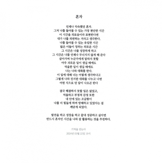 그는 "나를 돌아볼 수 있는 유일한 시간. 많은 이가 칭하는 외로운 시간"이라며 "그 시간은 나를 성장하게 하고 그 시간은 나를 언제나 무너지지 않게 해 준다"라고 털어놨다.