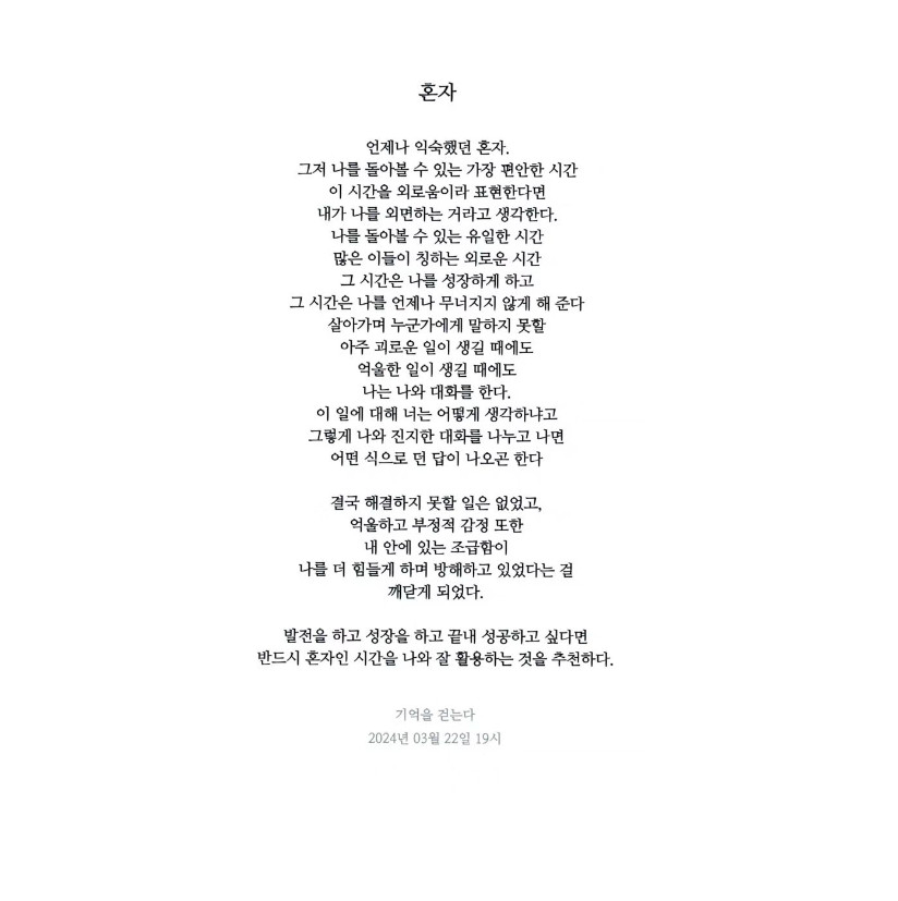 또한 "결국 해결하지 못 할 일은 없었고 억울하고 부정적 감정 또한 내 안에 있는 조급함이 나를 더 힘들게 하며 방해하고 있었다는 걸 깨닫게 됐다"라며 "발전하고 성장하고 끝내 성공하고 싶다면 반드시 혼자인 시간을 나와 잘 활용하는 걸 추천한다"라고 조언했다.