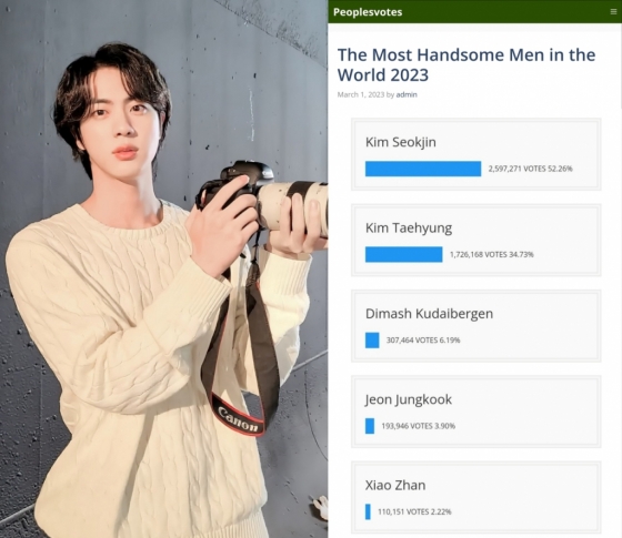 진은 '세계 최고 미남 1위'와 함께 뷰티 웹사이트 '안드레이 뷰티 스튜디오' 선정 '세상에서 제일 잘생긴 남자', 네덜란드 비주얼 아티스트팀 슬루이 페인팅(Sluis Painting) 선정 '세계에서 가장 완벽한 남자 얼굴' 1위, 체코 인형 장인들이 뽑은 '세계에서 가장 조각 같은 얼굴' 1위, KAZAN 아트스쿨 선정 'Naturally Art Face 1위' 등 세계의 각 전문가가 선정한 수많은 '미의 남신' 미의 남신 타이틀의 주인공이다. 전 세계의 비주얼 투표를 휩쓰는 것은 물론 대중과 전문가들에게도 최고라고 인정받는 압도적인 미모의 소유자로서, 특히 이 타이틀들에는 시술이나 수술 등을 하지 않은 태어난 그대로의 얼굴일 것이라는 자격 조건이 있어 진이 전 세계적인 자연 미남의 대명사임을 입증했다.