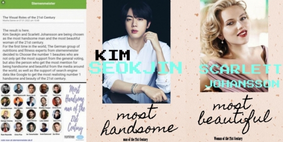 진은 독일 '스턴마이스터'(Sternmeister)로부터 미국 배우 스칼렛 요한슨과 함께 '21세기 최고 미남미녀'로도 뽑혔으며 국내외 성형외과의들에게 가장 완벽하며 이상적인 황금 비율 얼굴과 이목구비라고 분석됐다. 최근 국내 성형외과의들에 의해 남성 고객들이 가장 원하는 얼굴이 진이라는 사실이 밝혀지기도 했다.