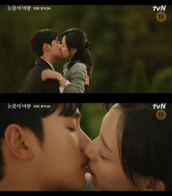 김수현은 작품에서 배우 김지원과 부부로 호흡하고 있다. 지난 23일 방송된 '눈물의 여왕' 엔딩에서는 두 사람의 눈물을 흘리며 애틋한 입맞춤을 하는 모습이 전파를 타 시청자들의 큰 관심을 모았다.