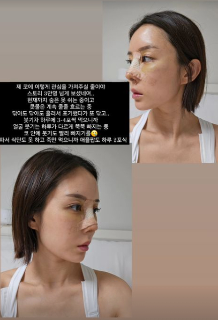 이후 이소라는 현재 상태에 대해 "제 코에 대해 이렇게 관심을 가져주실 줄이야. 스토리 3만명 넘게 보셨네요"라며 "현재까지 숨은 못쉬는 중이고 콧물은 계속 줄줄 흐르는 중. 닦아도 닦아도 흘러서 포기했다가 또 닦고 붓기차 하루에 3~4포씩 먹으니까 얼굴 붓기는 하루가 다르게 쭉쭉 빠지는 중. 코안에 붓기도 빠지기를"이라고 밝혔다.