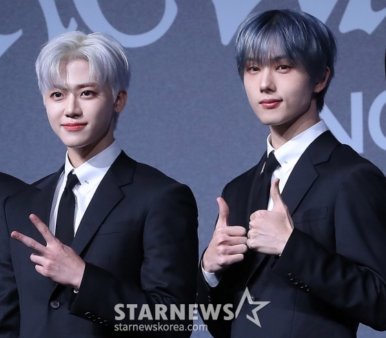 그룹 NCT DREAM(엔시티 드림) 재민, 지성이 25일 오후 서울 광진구 그랜드 워커힐 서울에서 진행된 새 앨범 'DREAM( )SCAPE'(드림 이스케이프) 발매 기념 기자간담회에 참석해 포즈를 취하고 있다.