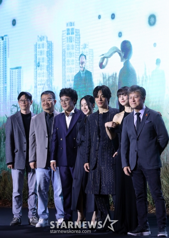류용재 작가, 연상호 감독, 배우 김인권, 이정현, 구교환, 전소니, 권해효가 26일 오전 서울 용산구 드래곤 시티에서 진행된 넷플릭스 시리즈 '기생수: 더 그레이' 제작발표회에 참석해 포즈를 취하고 있다.