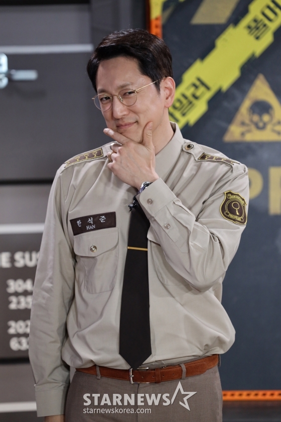방송인 한석준이 28일 오후 온라인으로 진행된 AXN의 예능 '풀어파일러 4' 제작발표회에 참석해 포즈를 취하고 있다.