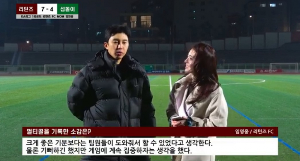 리턴즈 FC는 지난 28일 유튜브 채널을 통해 개막전 경기 맨 오브 더 매치(MOM)로 선정된 임영웅과의 인터뷰를 공개했다. 임영웅은 "일단 첫 경기부터 승리를 할 수 있어서 너무 기쁘다"며 "승리했다는 것에 안주하지 않고 다음 경기를 잘 준비하겠다"고 밝혔다.