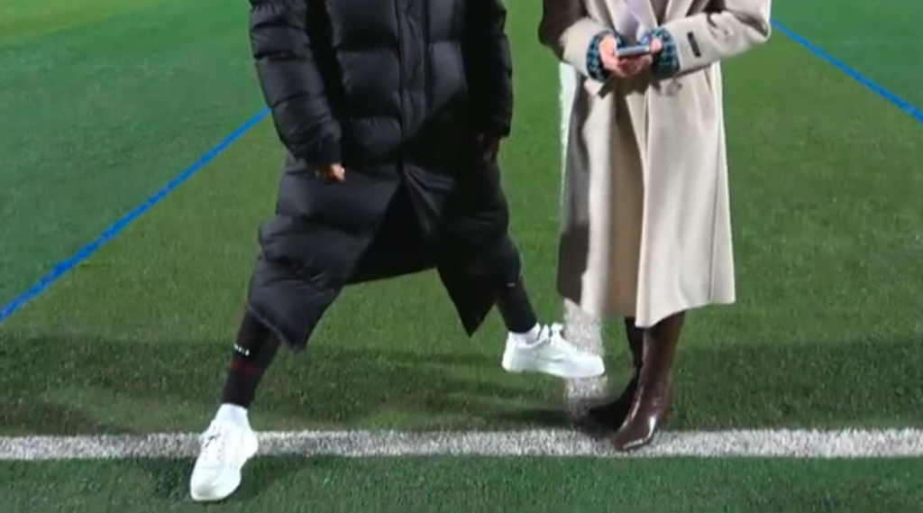 가수 임영웅이 '임매시' 수식어에 걸맞은 축구 실력을 뽐냈다. 수훈 선수로 선정된 그는 리포터와 인터뷰에서 눈높이를 맞추려 '매너 다리'까지 선보여 훈훈함을 자아냈다.