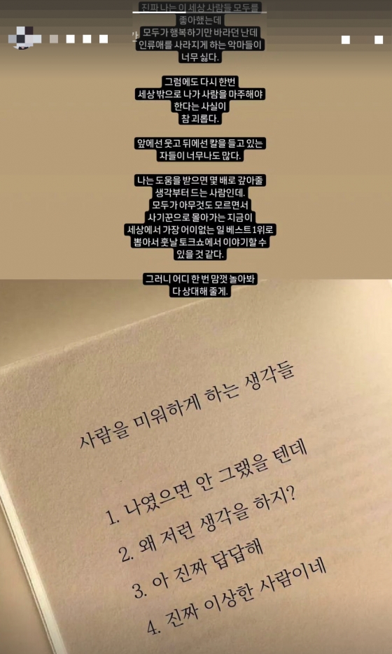 아름은 "진짜 나는 이 세상 사람들 모두를 좋아했는데 모두가 행복하기만 바라던 난데 인류애를 사라지게 하는 악마들이 너무 싫다"라며 "그럼에도 다시 한번 세상 밖으로 나가 사람을 마주해야 한다는 사실이 참 괴롭다"라고 전했다.
