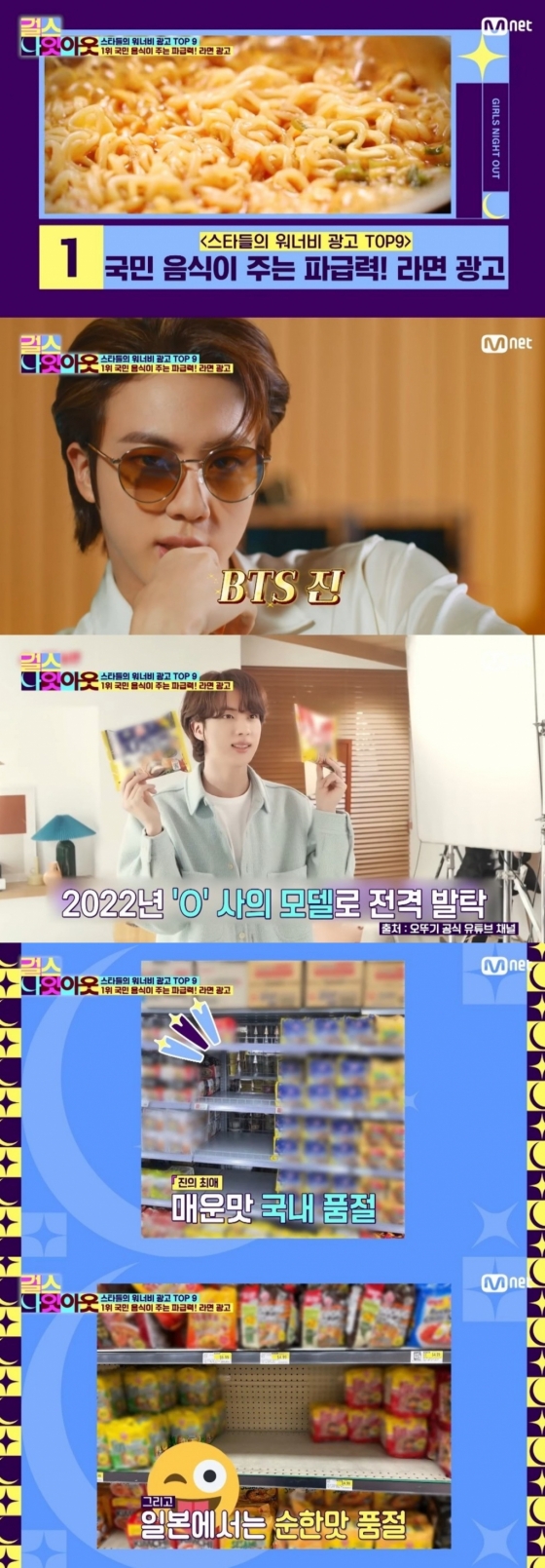 엠넷 차트쇼 '걸스 나잇 아웃'에서는 '셀럽이 출연하고 싶은 광고 1위'가 라면으로 선정되며 진이 언급된 바 있다.