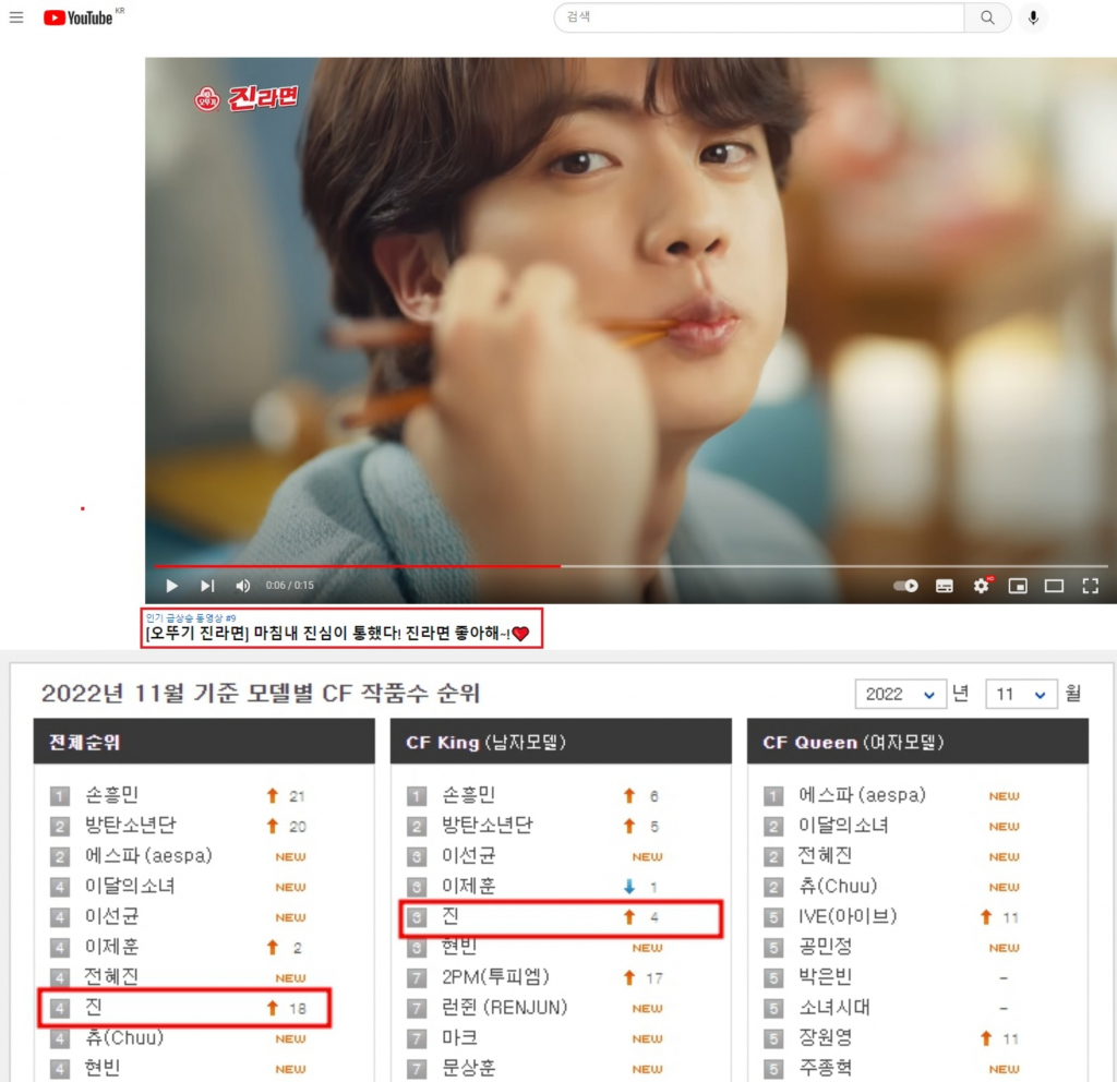 또 진은 한국광고총연합회 광고정보센터가 공개한 2022년 11월 CF모델 랭킹 결과 공동 4위를 차지했다. 남자 모델 순위에서는 공동 3위에 올랐다. 역시 진라면 단 한 광고로 이룬 이례적인 결과다.