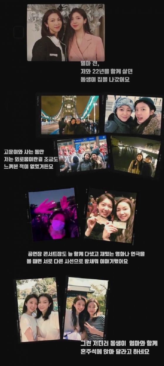 이어 '고운이가 4월의 신부가 되어 결혼한다. 사랑하는 사람을 만나 가정을 꾸리는 걸 보니 기특하고 대견하고, 참 잘 컸다는 생각이 들면서 뭉클하기도, 서운하기도, 기쁘기도 한 복잡한 감정이 들더라. 그런 저더러 동생이 엄마와 함께 혼주석에 앉아 달라고 한다. 언니가 나를 키웠으니 꼭 앉아 줬으면 한다고'라며 '저는 동생과 일생을 기록하기로 마음먹었다. 즐겁게 놀고, 일하고, 배우고, 도전하고, 성장하는 모습을 남겨야겠다고 마음먹었다. 헤어지는 게 아니라 이제 시작이라고. 어설프고 느리더라도 조금씩 기록하려고 한다'고 강조했다.