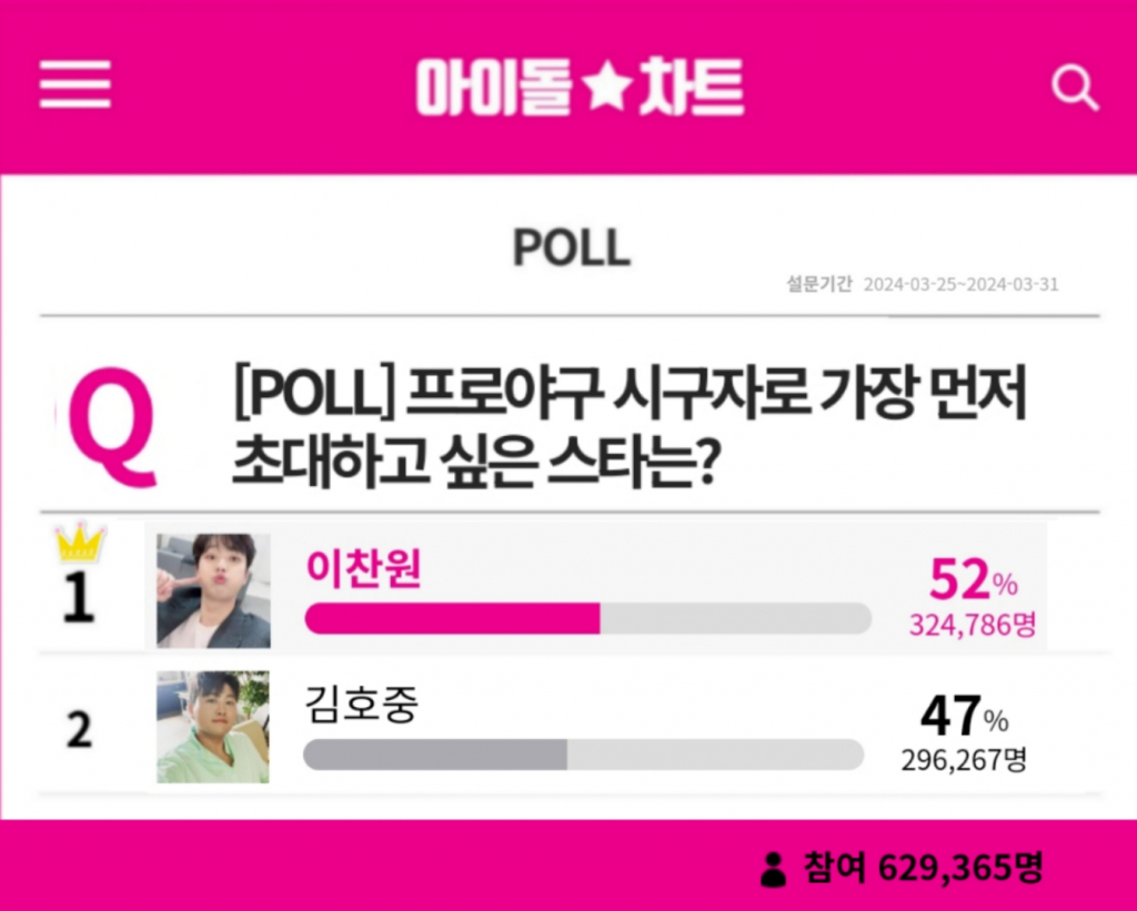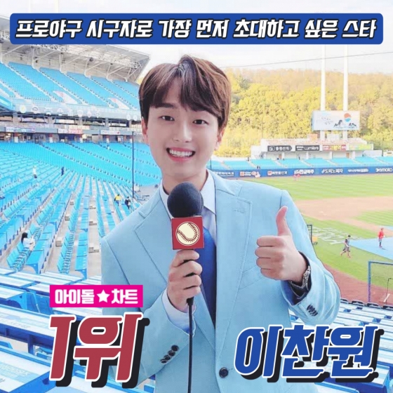 가수 이찬원이 '프로야구 시구자로 가장 먼저 초대하고 싶은 스타' 1위에 오르며 존재감을 빛냈다.