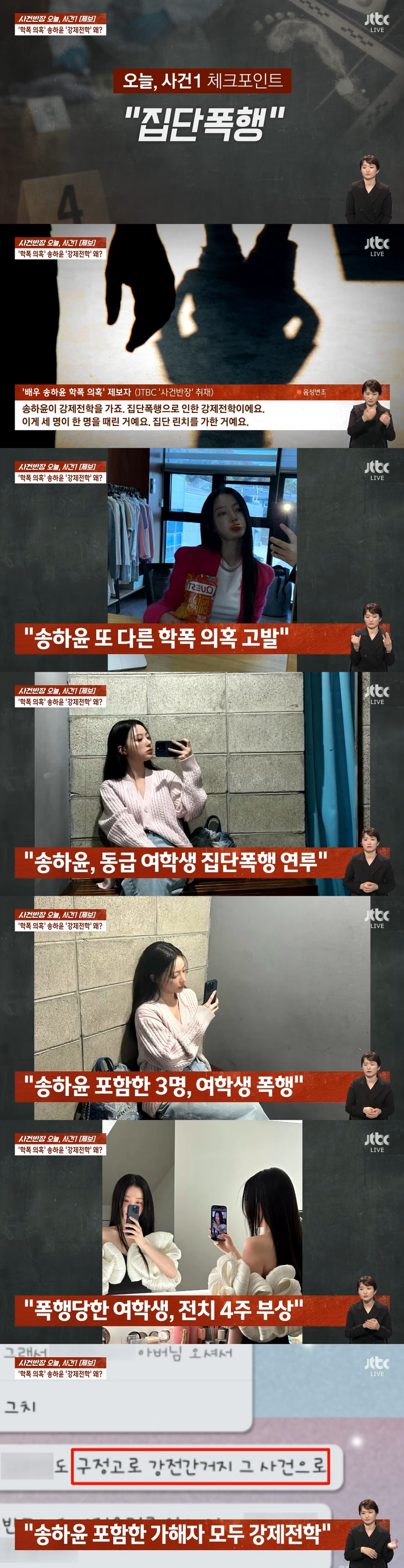 이와 관련해 '사건반장'은 "20년 전 강제 전학이라는 게 쉽지 않다"면서 "학교 폭력에 연루돼있다는 걸 암시하는 내용이다. 제보자의 주장에 따르면, 송하윤의 동급생인 여성이 송하윤을 포함한 세 명에게 집단 구타를 당했다는 거다. 그 피해가 전치 4주에 이르렀다고 한다. 굉장한 중상이다. 단순 폭행이 아니라 상해다. 집행유예를 넘어 합의가 안 되면 실형까지 이를 수 있는 사안이다"라고 설명했다.