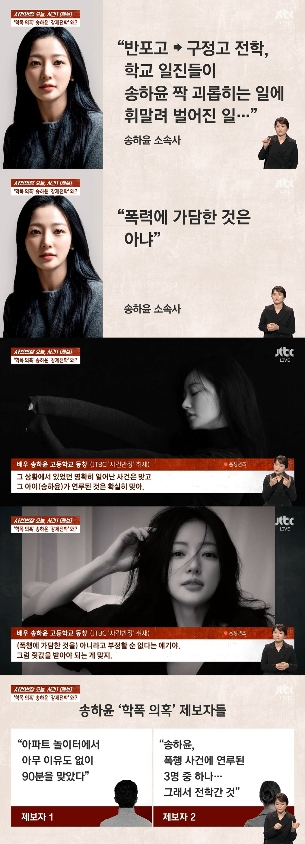 앞서 제보자 A 씨는 지난 1일, '사건반장'을 통해 고등학교 재학 당시 송하윤에게 90분 동안 따귀를 맞았다고 주장했다. 이후 송하윤이 경기도 부천의 중원고등학교에서 서울 강남의 반포고등학교로 전학, 또 다시 압구정고등학교로 옮겼다는 사실이 알려지면서 '학폭으로 강제 전학 당한 것이 아니냐'라는 의혹까지 제기됐다.