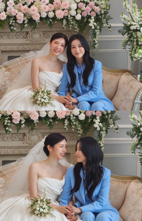 공개된 사진 속에는 채서진의 결혼식에 참석한 김옥빈의 모습이 담겨있다. 깔끔한 파란 정장을 입은 그는 다정한 눈빛으로 웨딩드레스를 입은 채서진을 바라보고 있어 눈길을 끈다.