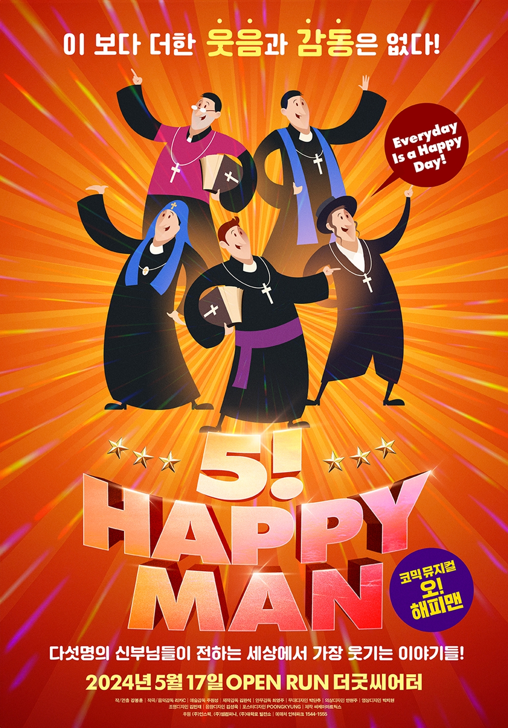 '5! 해피맨'은 다섯 명의 신부님들이 전하는 코믹 감동 휴먼 뮤지컬이다. 평화로운 시골 성당에서 신부들과 마을 사람들이 함께하는 자선 행사가 열리고, 그 이후 뒷풀이 현장에서 자선기금을 잃어버리는 사건을 유쾌하게 그려낸다.