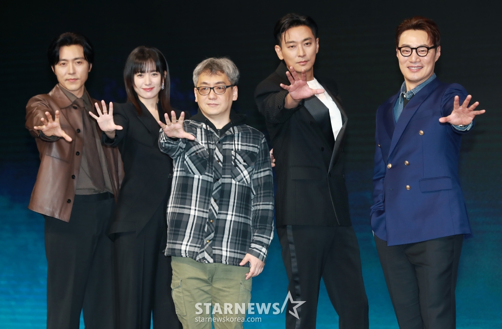 배우 이무생, 한효주, 박철환 감독, 배우 주지훈, 이희준이 8일 오전 서울 여의도 콘래드호텔에서 진행된 디즈니+ '지배종' 제작발표회에 참석해 포즈를 취하고 있다.