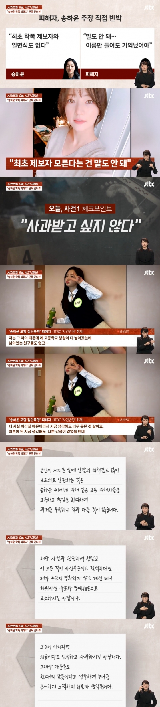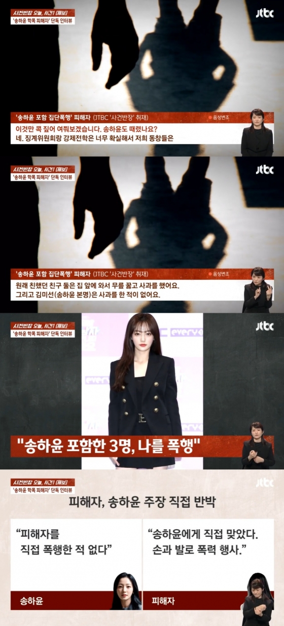 8일 오후 방송된 JTBC '사건반장'에서는 송하윤에게 학폭 피해를 입었다고 주장하는 A 씨의 단독 인터뷰가 공개됐다.