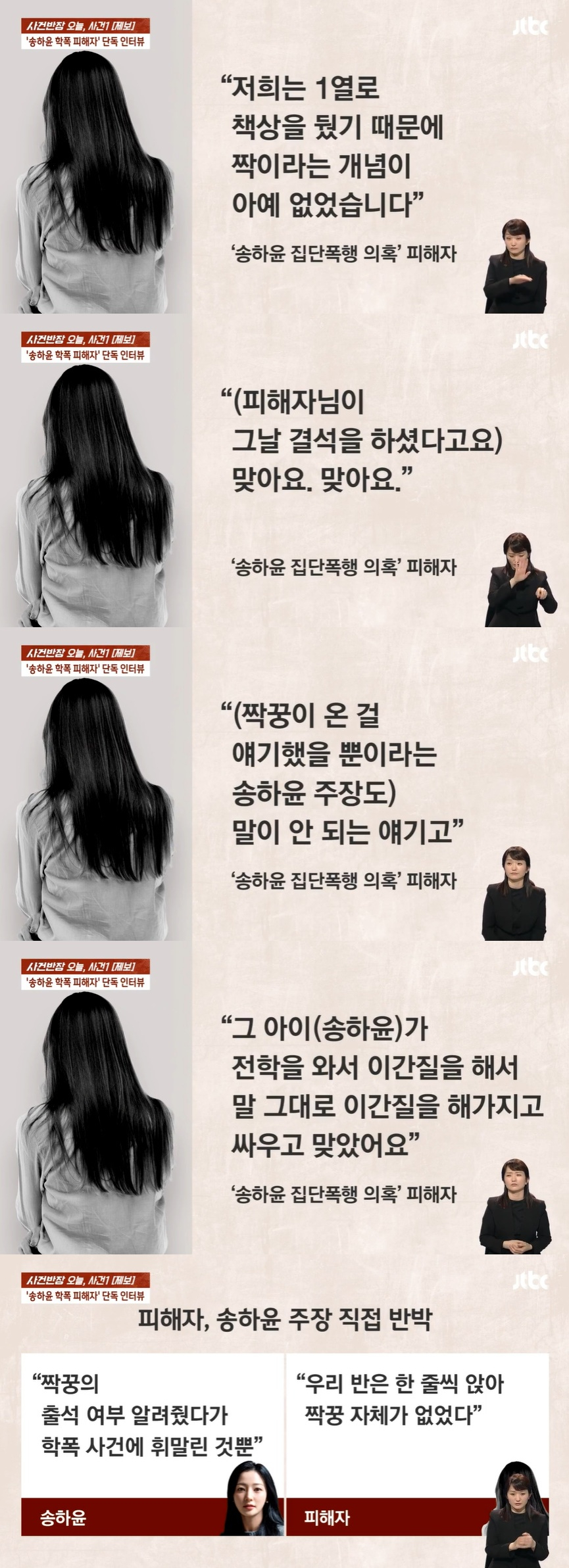 그러나 A 씨는 8일 '사건반장'을 통해 "우리는 1열로 책상을 뒀기 때문에 짝이라는 개념이 아예 없었다. 짝꿍이었다고 하는데 우리는 두 줄로 앉지 않고 한 줄로 앉았다"면서 "나는 그날 결석했다. (짝꿍이 온 걸 얘기했을 뿐이라는 송하윤 주장도) 말이 안 되는 얘기다. 우리 셋은 원래 너무 친한 사이였고 나는 그전까지 학교 생활도 아무 문제가 없었다. 그 아이(송하윤)가 전학을 와서 이간질을 해서 말 그대로 이간질을 해가지고 싸우고 맞았다. 안 때렸다고 하는 것 자체도 거짓말이다"라고 주장했다.