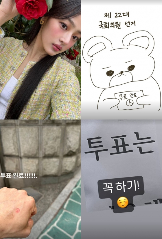 뉴진스 민지는 10일 뉴진스 공식 인스타그램 스토리를 통해 '제22대 국회의원 선거'란 글과 함께 투표용지를 들고 있는 곰돌이 사진을 게재했다. 2004년생인 민지는 생애 첫 투표권을 행사한 만큼, 독특하게 투표 인증해 이목을 끌었다.