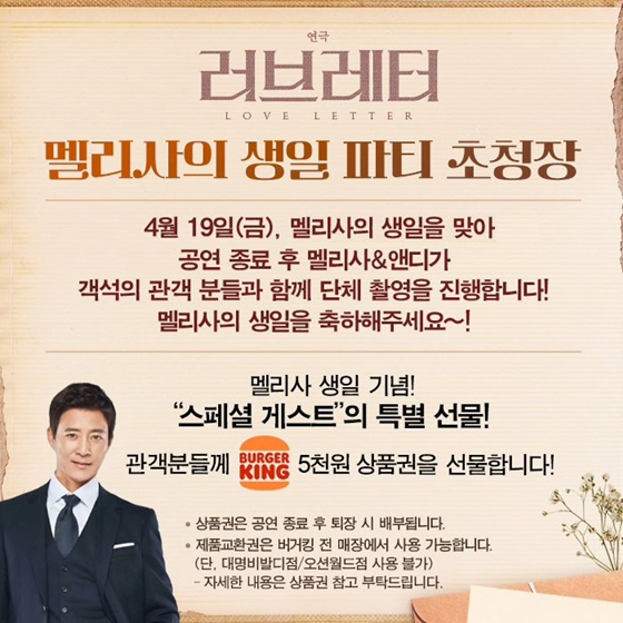 최수종은 오는 19일 '러브레터' 공연을 찾는 400여 명의 관객들에게 버거킹 5천원 상품권을 선물한다.