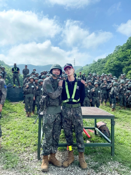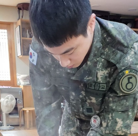진은 사진에서 '특급 전사', '조교'라고 쓰여있는 군복을 입은 채 민낯과 짧게 깎은 머리에도 '미의 남신'으로 불리는 최고의 비주얼을 자랑했다. 육군 최전방인 5사단 열쇠부대 마크가 새겨진 뱃지도 보인다. 남자다운 짙은 눈썹, 그린 듯한 눈매와 높은 콧대, 도톰한 입술이 꽉 찬 작은 얼굴과 티없이 맑은 도자기 피부는 보는 이들의 감탄을 자아냈다. 진은 훤칠한 키와 황금 비율 피지컬로 집중해서 술을 빚고 있는 모습이다.