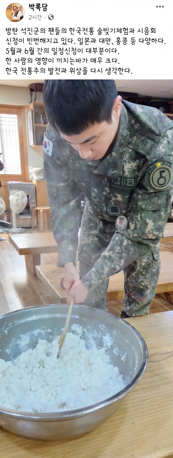 17일 전통주 명인이자 한국전통주연구소 소장인 박록담은 자신의 페이스북을 통해 "방탄 석진군 팬들의 한국 전통 술빚기 체험과 시음회 신청이 빈번해지고 있다. 일본과 대만, 홍콩 등 다양하다"라고 말하며 "한 사람의 영향이 끼치는 바가 매우 크다. 한국 전통주의 발전과 위상을 다시 생각한다 "라며 진의 사진 한장을 공개했다.