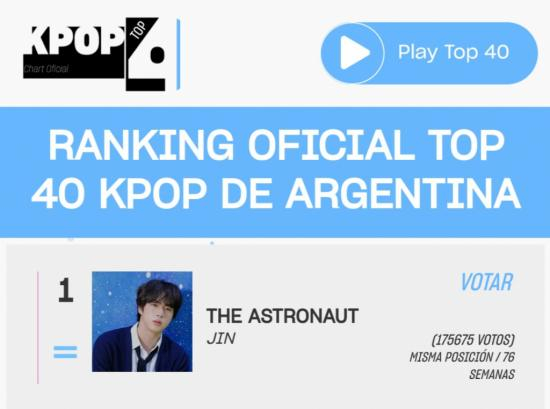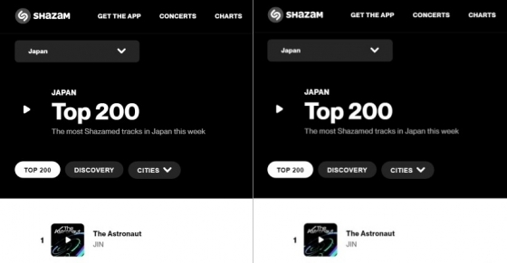 최근 진의 '디 애스트로넛'은 지난 4월 5일과 6일, 세계 최대 음원 검색 플랫폼 샤잠(Shazam) '일본 TOP200' 차트에서 이틀 연속 1위를 재탈환하며 총 324일 1위라는 대기록을 세웠다.