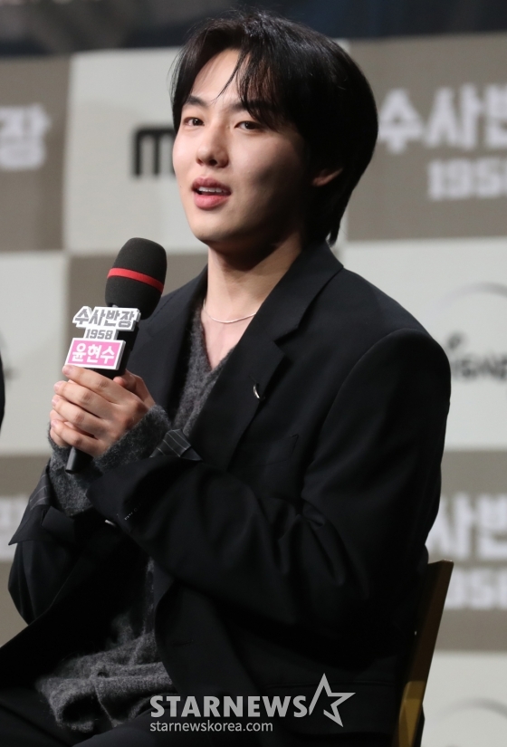 배우 윤현수가 18일 오후 서울 상암 MBC에서 열린 MBC 새 금토드라마 '수사반장 1958' 제작발표회에 참석해 인사말을 하고 있다.