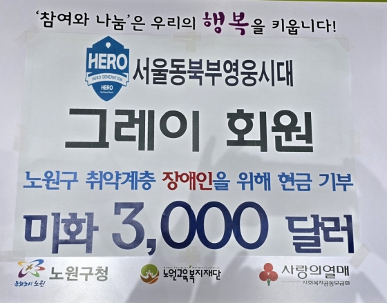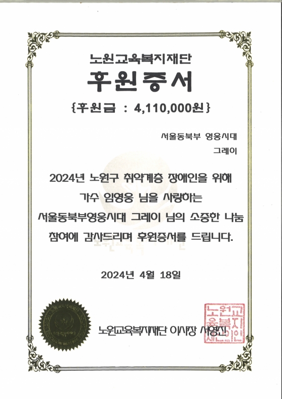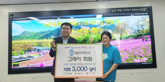 임영웅 팬클럽 서울 동북부 영웅시대 회원 그레이(한국명 이병남) 씨는 4월 18일 서울 노원구청(구청장 오승록)을 찾아 기부금을 전달했다.