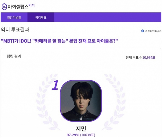 지민은 4월 7일부터 4월 13일까지 익사이팅 디시에서 진행된 "'MBTI가 IDOL!' 카메라를 잘 찾는 '본업 천재 프로 아이돌'" 설문에서 총투표수 1만 934표 가운데 1만 638표를 얻어 1위를 차지했다.