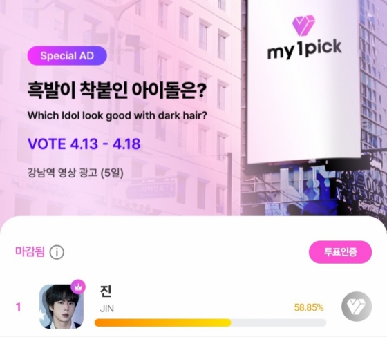 마이원픽에서 독보적인 인기를 자랑하는 진은 앞서 테마투표 '같이 벚꽃 보고 싶은 스타는?' 설문에서도 1위를 차지한 바 있다.