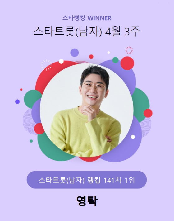 영탁은 4월 18일 오후 3시 1분부터 4월 25일 오후 3시까지 진행된 4월 3주차(141차) 스타트롯 남자 랭킹 투표에서 1위를 차지했다.