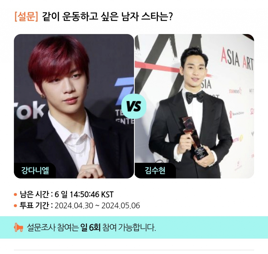 모바일 아티스트 종합 콘텐츠 앱 스타폴(STARPOLL)은 30일부터 5월 6일까지 '같이 운동하고 싶은 남자스타는?'이라는 주제로 설문 조사를 진행한다.