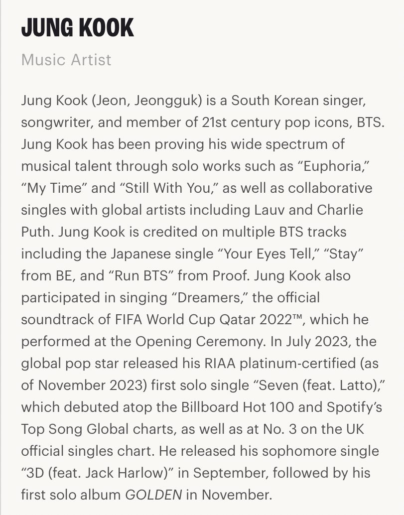 또 "2023년 7월, 글로벌 팝스타(정국)는 첫 번째 솔로 싱글 'Seven'(세븐)을 발표했고, 미국 '레코드산업협회'(Recording Industry Association of America, RIAA)가 미국에서 100만 유닛(units) 이상 팔린 음원에 부여하는 'RIAA 플래티넘' 인증을 획득했다.(2023년 11월 기준) 'Seven'은 '빌보드'(Billboard) 메인 싱글 차트 핫 100과 '스포티파이'(Spotify) 톱 송 글로벌 차트 1위는 물론 '영국 오피셜'(UK Official) 메인 싱글 차트 '톱 100' 3위를 기록했다"고 소개했다.