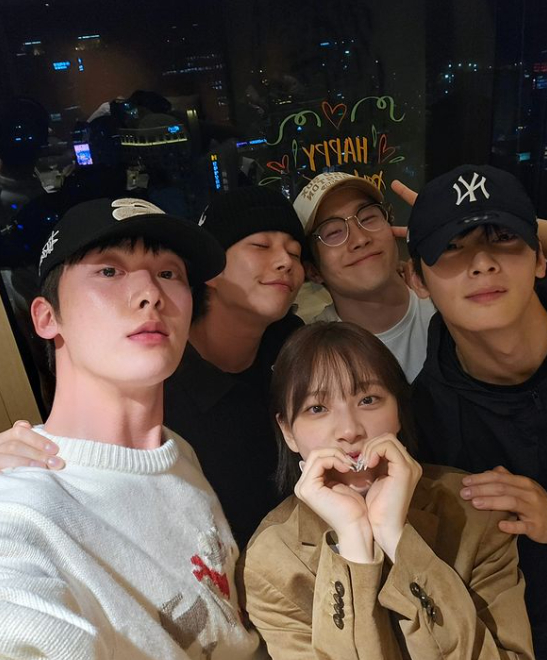 사진에는 윤산하와 MJ, 진진, 차은우 등 아스트로 멤버들에 더해 2023년 세상을 떠난 멤버 고 문빈의 친동생이기도 한 빌리 멤버 문수아도 포착됐다.