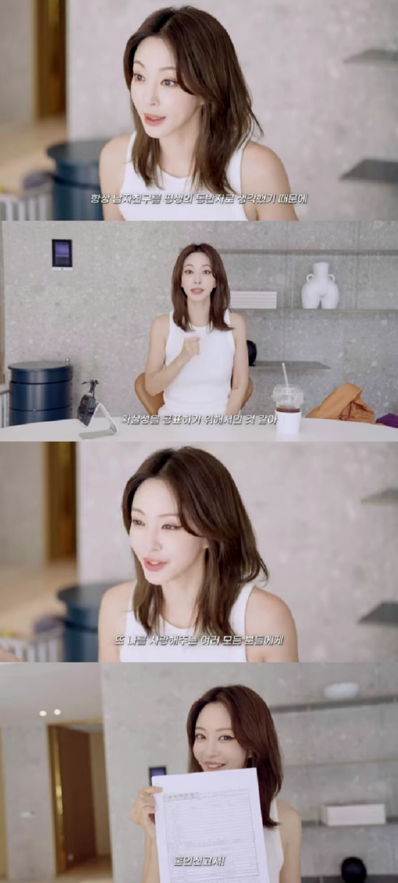 한예슬은 "지금 이 순간을 기다렸다. 내가 진짜 너무 좋고, '이거다' 싶은 건 변함 없고, 끝까지 하는 성향이기 때문에 내가 남자친구와 드디어 혼인신고를 했다"며 "이 영상을 찍을 때쯤이면 혼인신고를 하려고 준비하고 있는데, 나갈 때쯤이면 이미 혼인신고가 돼 있을 거다. 우리는 이제 정식으로 부부고, 나는 이제 품절녀가 됐다"고 말했다.