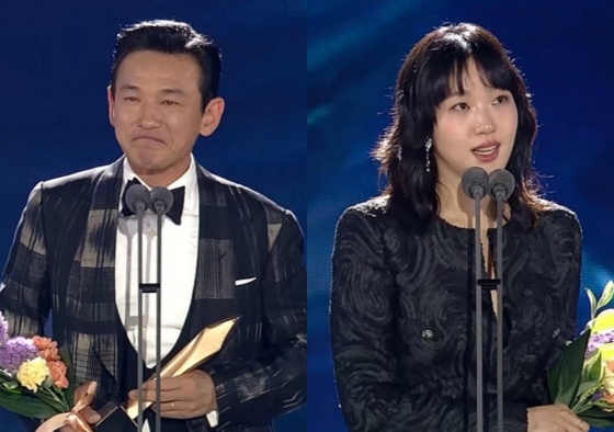 황정민과 김고은은 '서울의 봄'과 '파묘'로 영화 부문 최우수 연기상 트로피를 품에 안았다. 황정민은 "모든 분들의 용기가 필요했던 작업이었다. 난 용기가 없었는데 감독님은 '여러분들은 큰 용기를 가지고 있으니까 열심히 하셔도 된다'라고 계속해서 용기를 불러일으켜줬다. 시기가 안 좋을 때 개봉했지만 영화를 사랑해주신 관객분들의 큰 용기 덕분에 이 상을 받는 것 같다. 영광을 같이 나누고 싶다. 사랑하는 아내에게도 꼭 사랑한다고 말하고 싶다"라며 울컥한 목소리를 내뱉었다.
