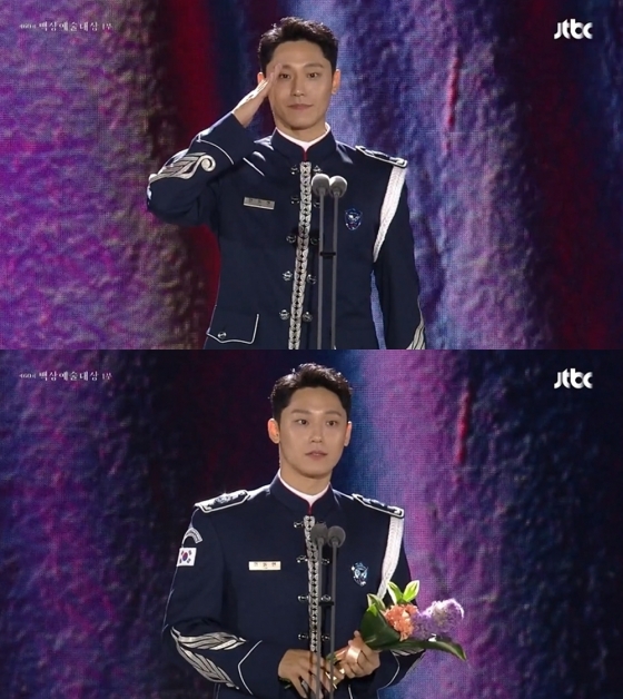 이날 제복을 입고 무대에 오른 이도현은 "필승! 현재 공군 군악대에서 복무 중인 임동현이자 배우 이도현"이라고 인사를 한 뒤 "'파묘' 봉길 역을 연기할 때 굉장히 어려웠지만 저에게는 너무나 큰 도전이고 좋은 기회라고 생각했다. '꼭 잘하고 싶다'라는 생각으로 열심히 했다. 감독님과 함께 연기한 선배님들께 이 자리를 빌려 감사드린다"라고 전했다.