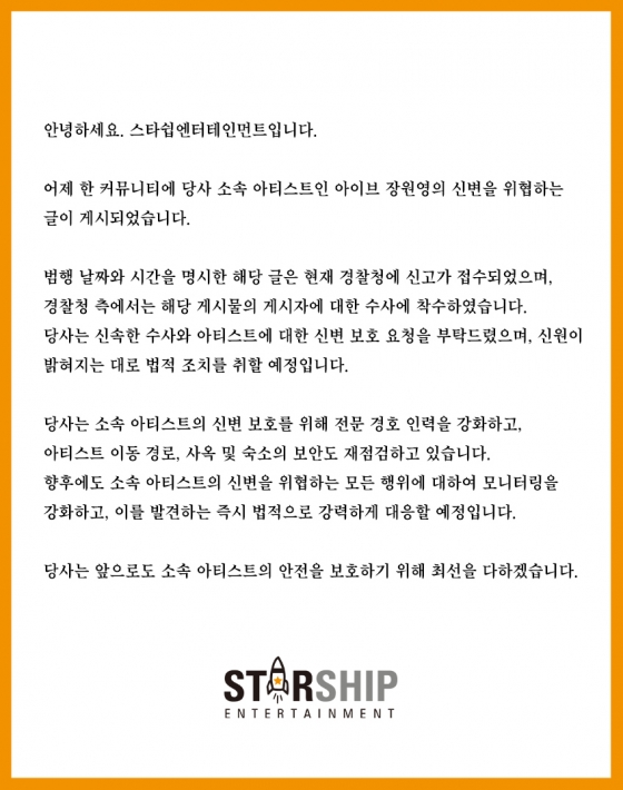 9일 스타쉽엔터테인먼트는 공식 SNS에 "어제 한 커뮤니티에 당사 소속 아티스트인 아이브 장원영의 신변을 위협하는 글이 게시됐다"고 운을 뗐다.