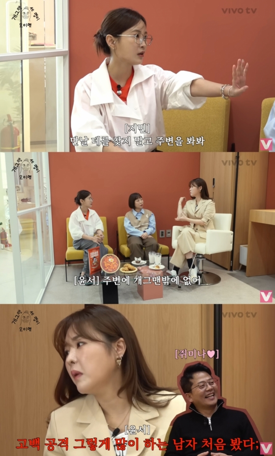 그러자 한윤서는 "난 고백 공격을 그렇게 하는 사람 처음 봤다. '지민아, 나랑 사귀어 줘'라고 하는 걸 직접 봤다"라고 당시를 떠올렸다. 또한 "난 잘생긴 사람 부담스럽다"라고 털어놓자, 김지민은 "근데 왜 김준호는 왜 편안해하냐. 잘생겼는데"라고 애정을 보였다. 그러면서도 김지민은 "(김준호의) 다리 길이가 나랑 똑같다. 키가 170cm이고 내가 158cm인데 한 치의 오차도 없다"라고 말해 웃음을 자아냈다.