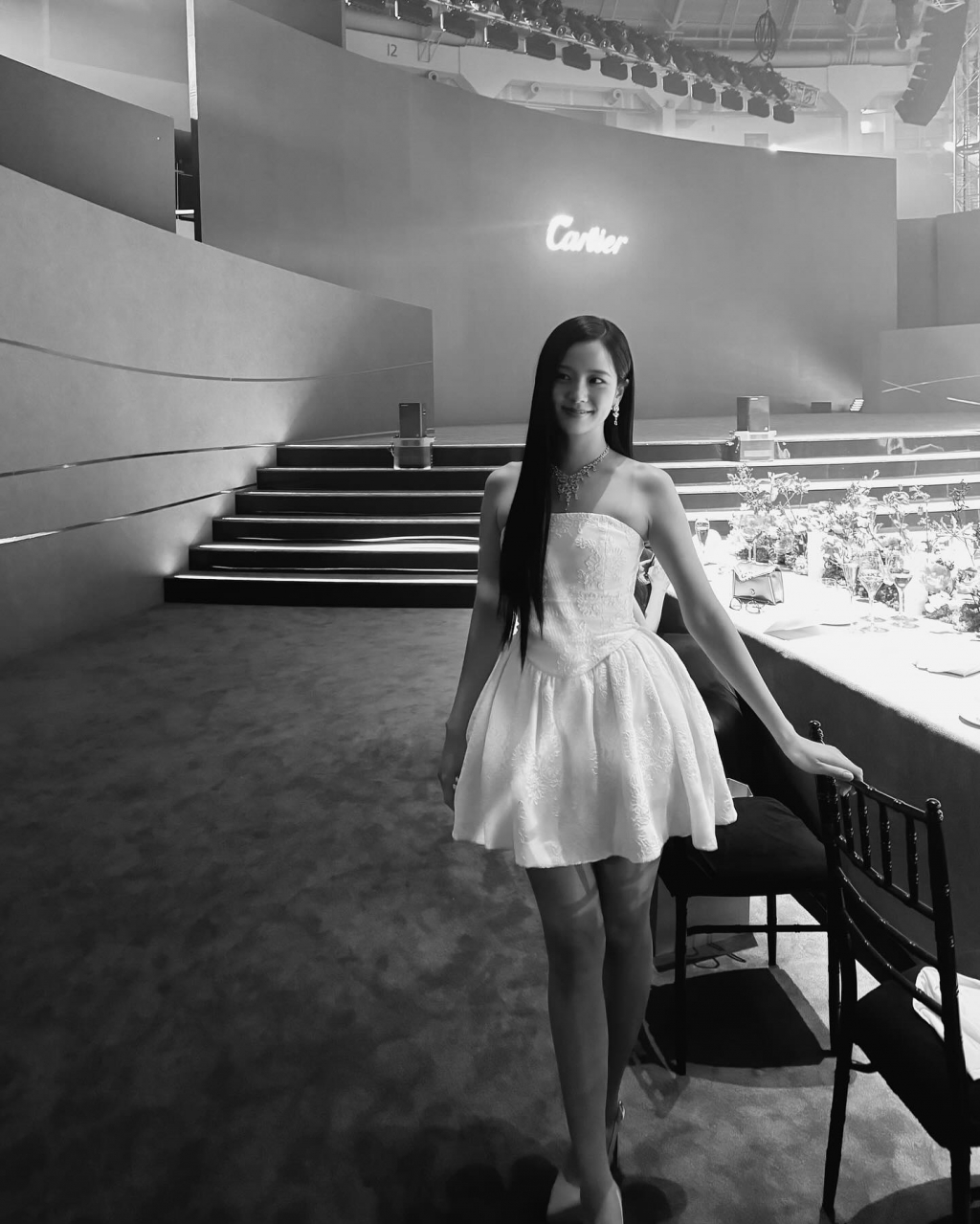 사진 속 지수는 흰색 끈이 없는 드레스와 함께 귀걸이와 목걸이가 포함된 주얼리 세트를 착용한 채 그림같은 미모로 눈부시게 빛났다. 지수가 착용한 주얼리 세트는 까르띠에의 새로운 하이 주얼리 컬렉션 'Le Voyage Recommence'의 것이다.
