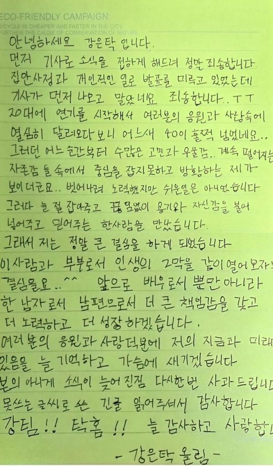 이하 강은탁 손편지 전문.