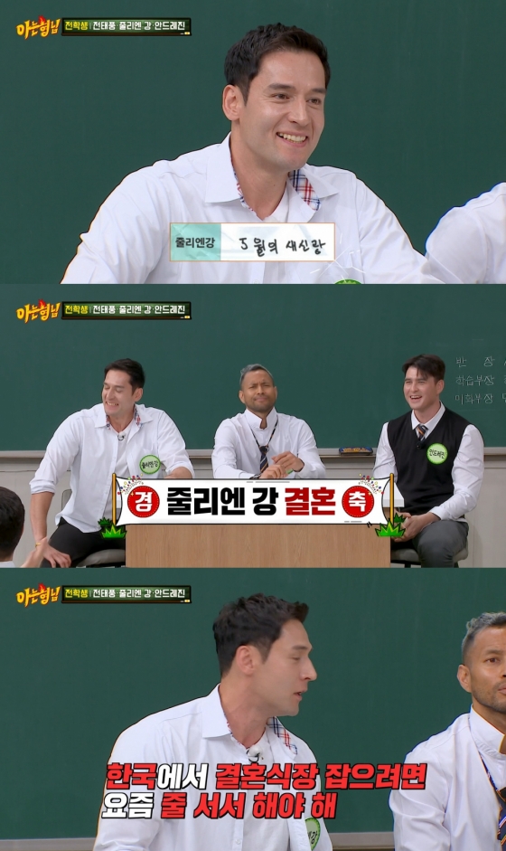 이날 전태풍은 줄리엔강에게 "얘 벌써 결혼했다. 작년에 했는데 초대 안 해줬다. SNS에 웨딩 사진 올렸다"라고 오해했다. 그러자 줄리엔강은 "청첩장 지금 주려고 했다. 아직 결혼 안 했다. 그건 한국이니까 웨딩 사진 찍고 결혼식 한다. 요즘 한국에서 결혼하려면 줄 서서 해야 한다"라고 말했다.